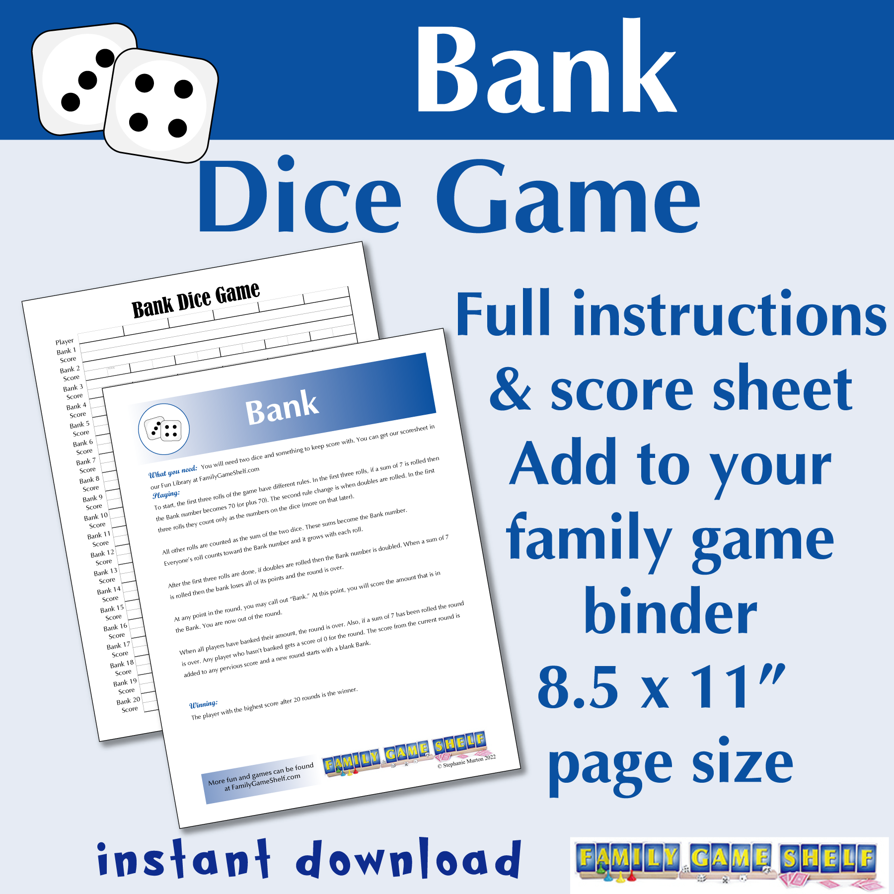 The Bank dice game is a push your luck game where all players play with the same numbers. Only those who choose to bank their money at the right time will win. Includes score sheet!