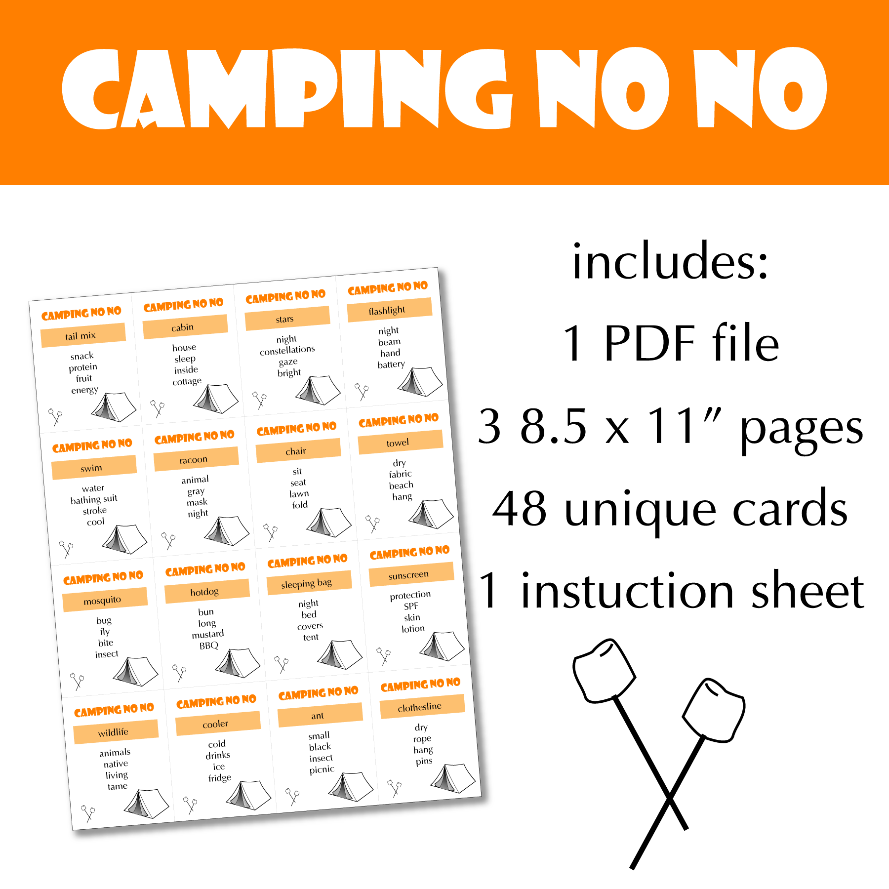 Camping No No will challenging you and make you laugh as you go through the 48 cards that are all about camping.