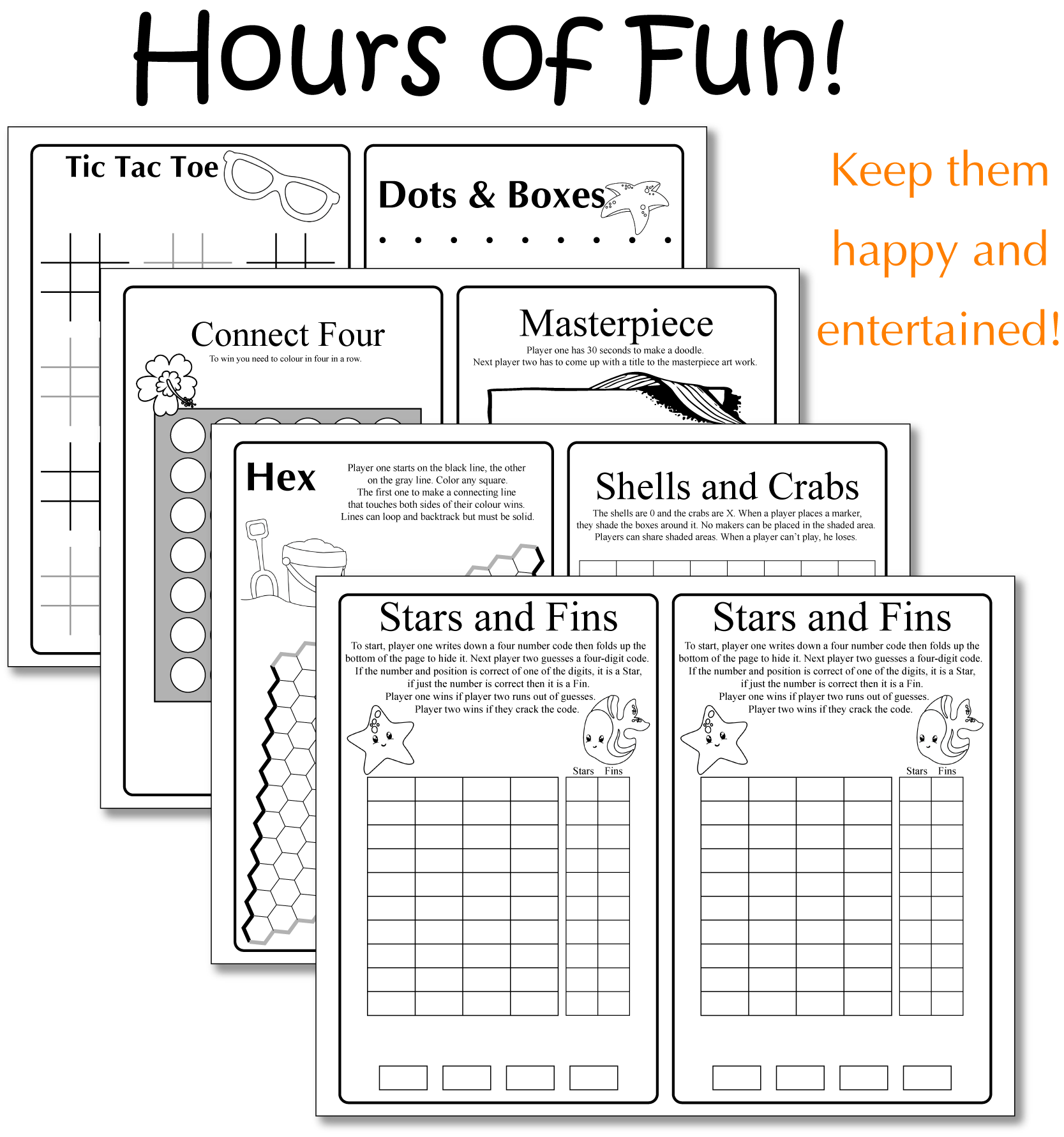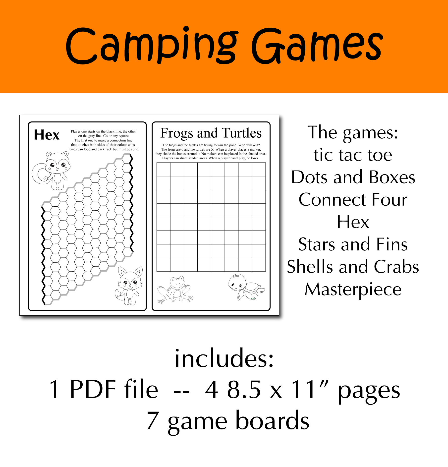 The games include Tic Tac Toe, Dots and Boxes, Hex, Frogs and Turtles, Connect Four, Masterpiece, and Bees and Bears. All games have a fun camping theme to them and print with little ink so it’s budget friendly and better for the environment.