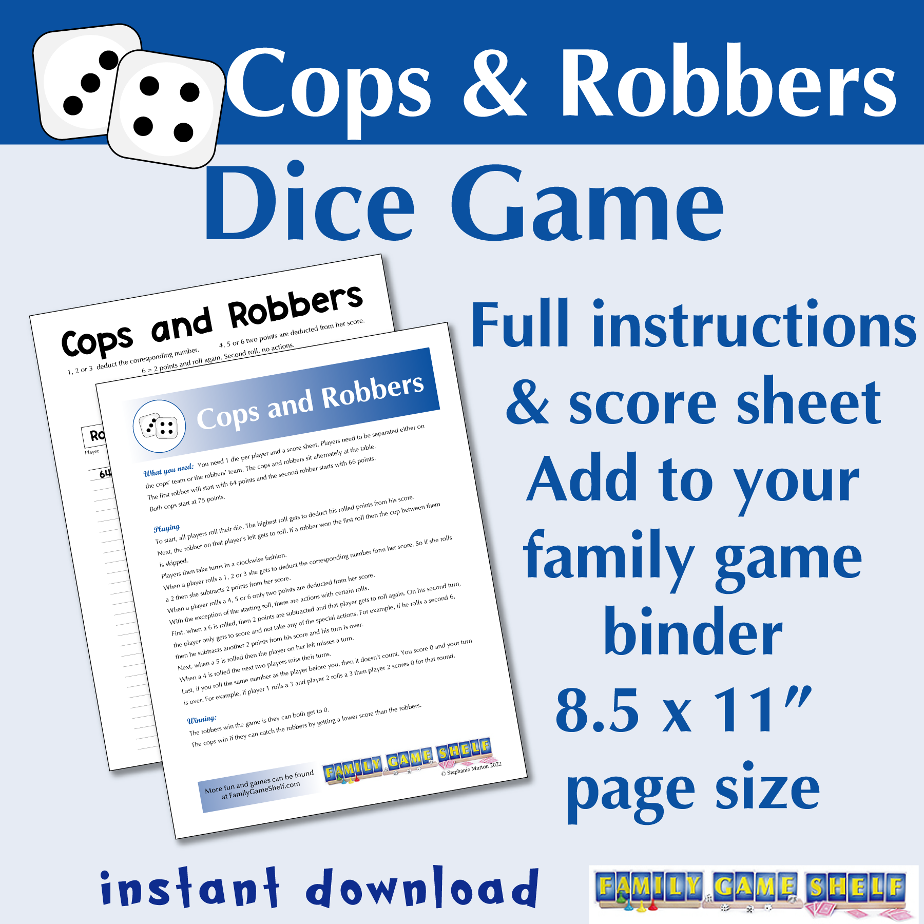 The classic kids’ game Cops and Robbers has made it to the dice table! This four player game will have the cops try to catch the robbers while they try to out run the cops. Who will win? Play to find out. Score sheet included!