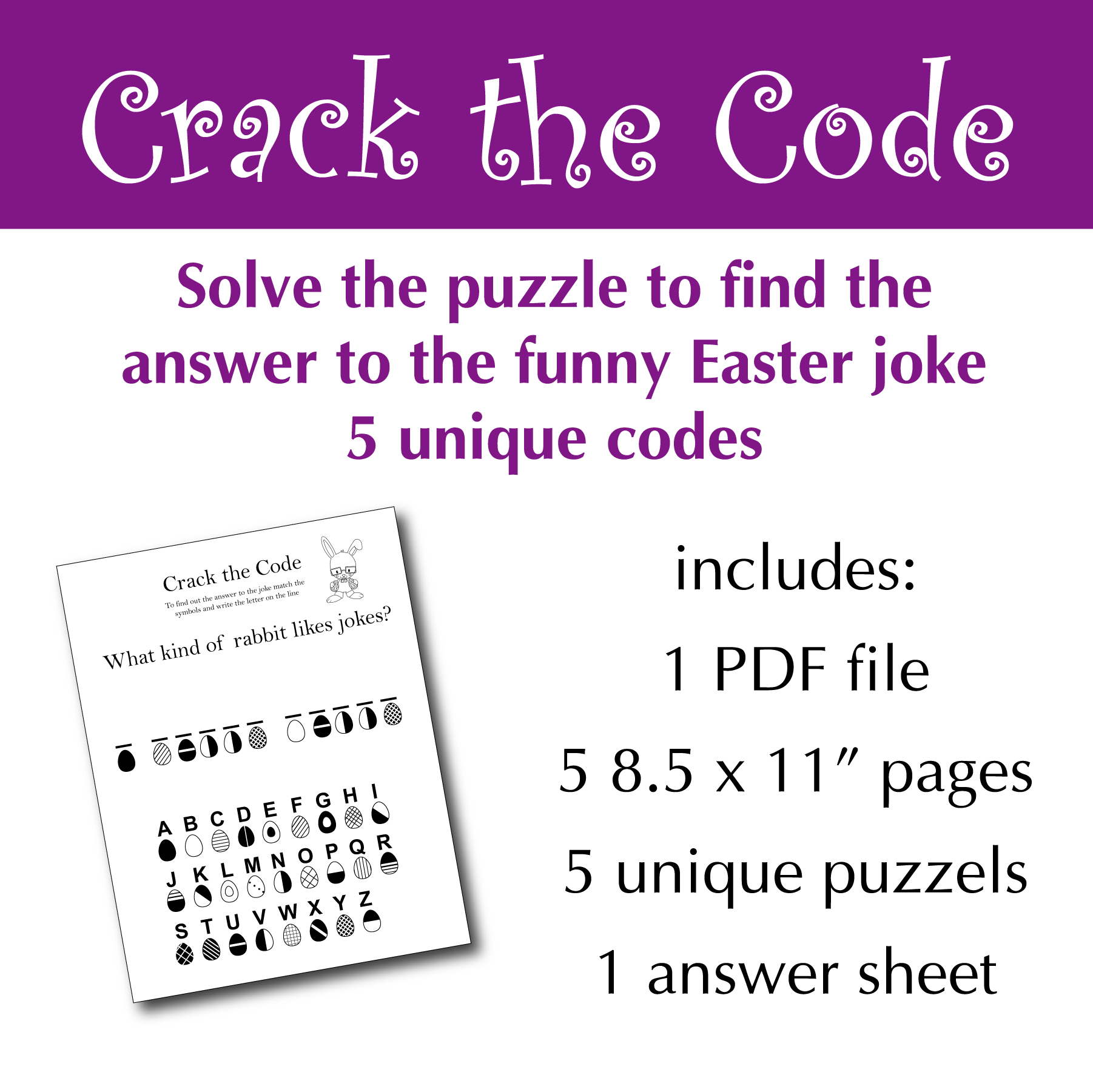 Kids love to crack the code and find the secret message. They also love jokes. Easter Crack the Code combines these two favorites as the code needs to be figured out to get the answer to the joke. There are five unique jokes to solve. The answers are included for in case of mishaps (but you don’t have to look at them until you’re done).