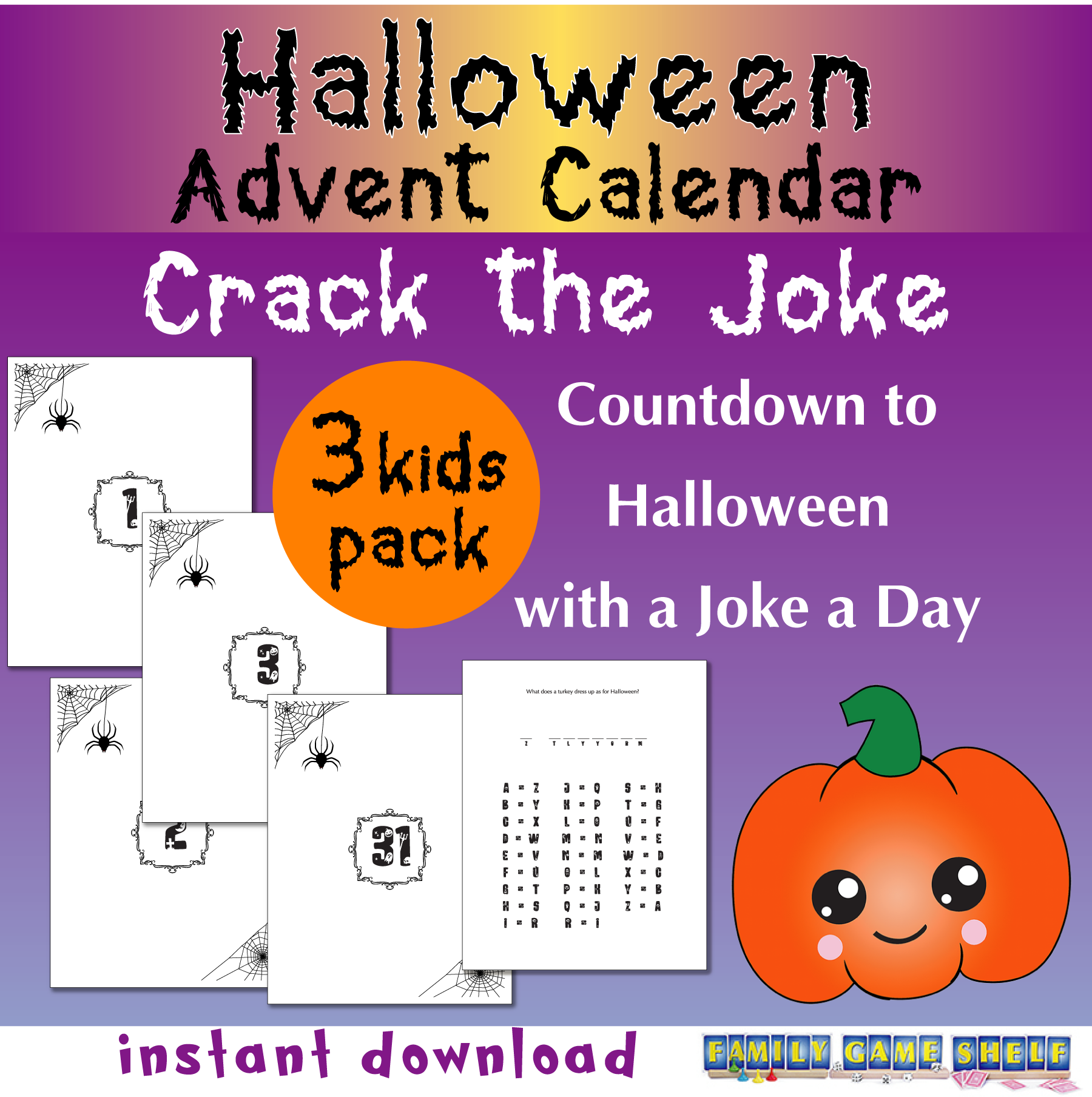 Get ready for 31 days of spooky fun with our printable Halloween Advent calendars, Halloween count down Crack the Joke for kids. 3 kid pack–perfect for three kids!