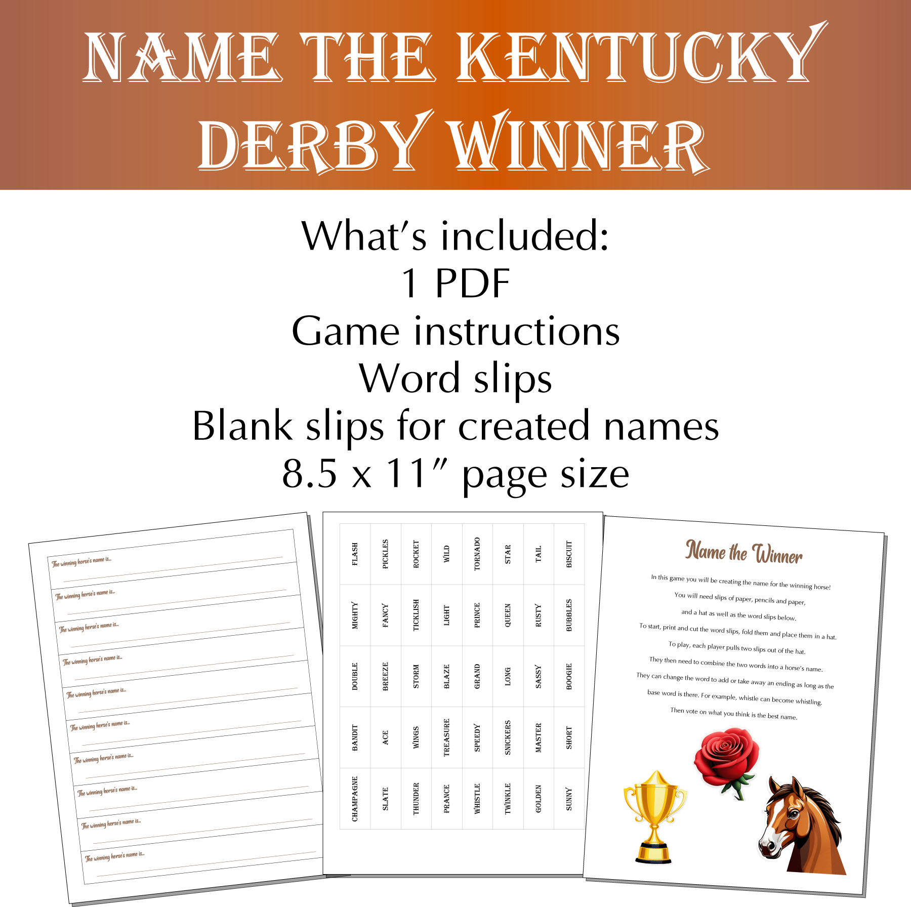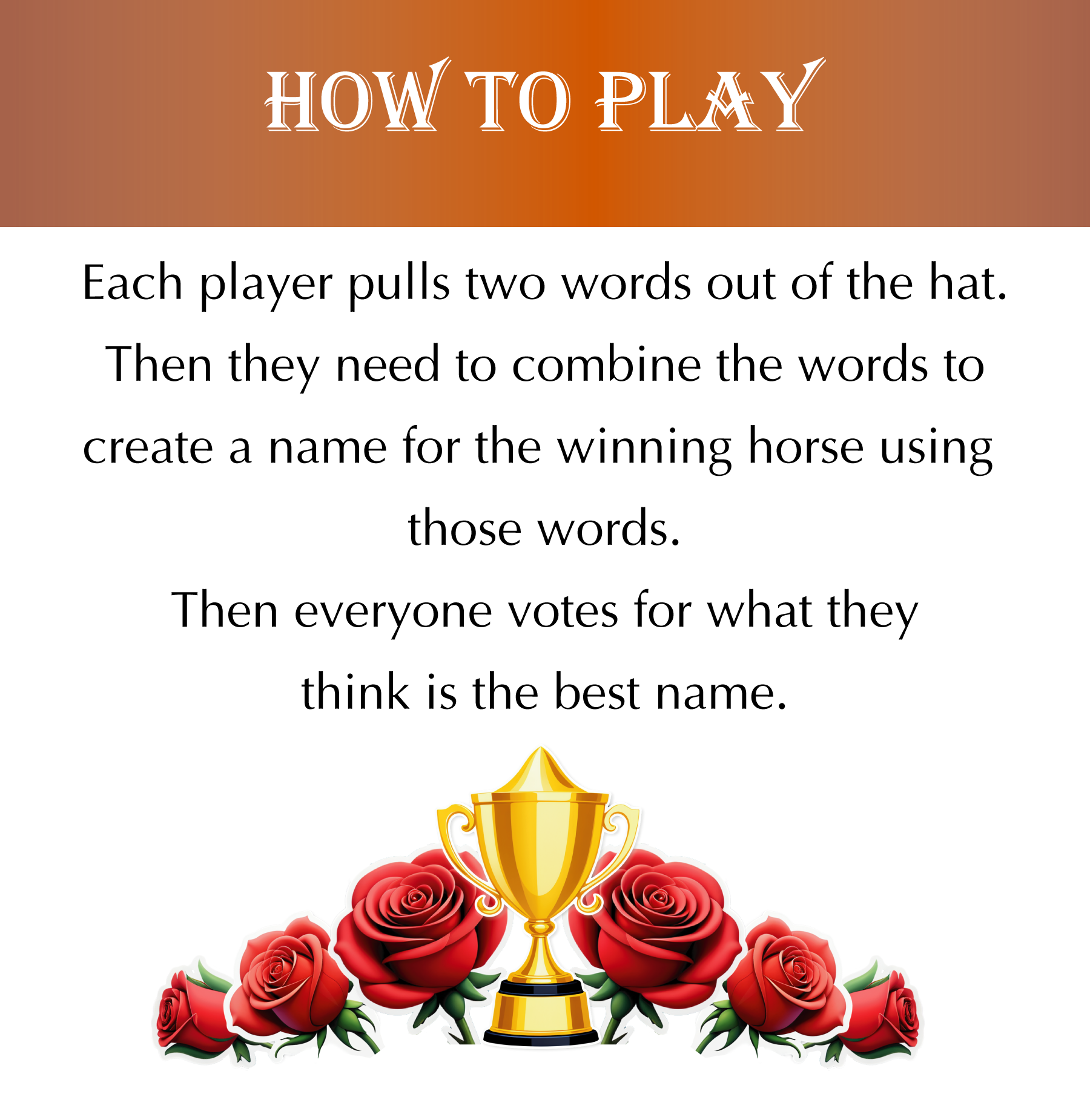 Name the Winning horse in this Kentucky Derby party game. Can you make the best horse name with the words given to you? Get your creative juices flowing in this printable game.