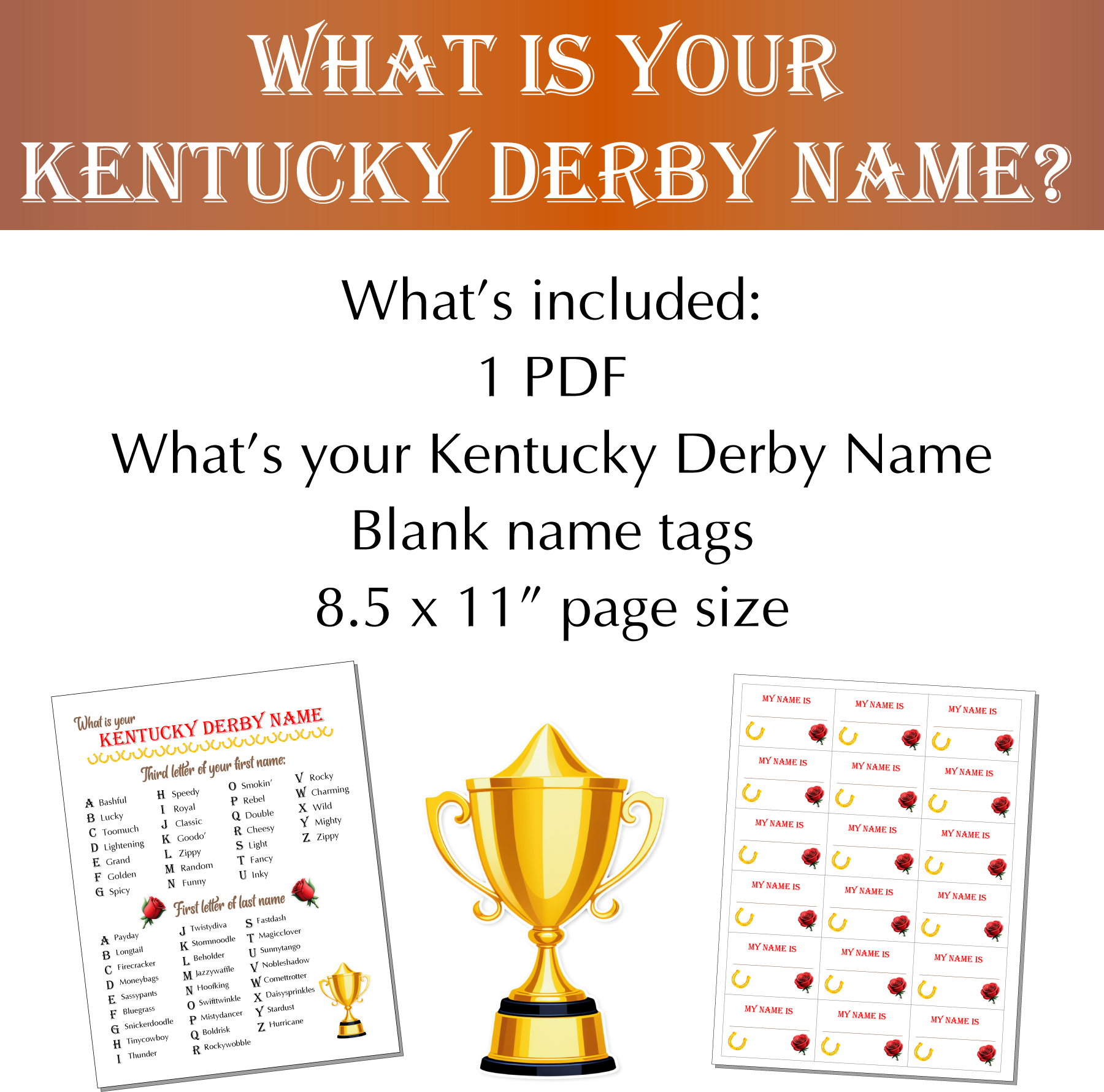 What is your Kentucky Derby name? Find out using the letters in your own name in this fun and silly game. Name tags are included to show off your new name!