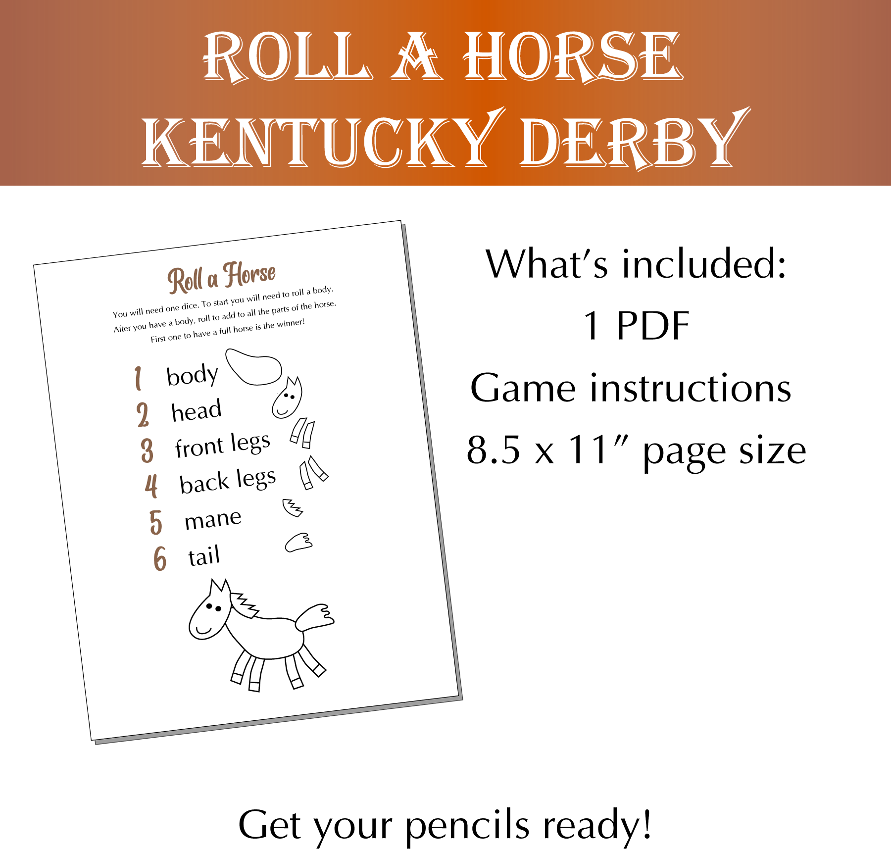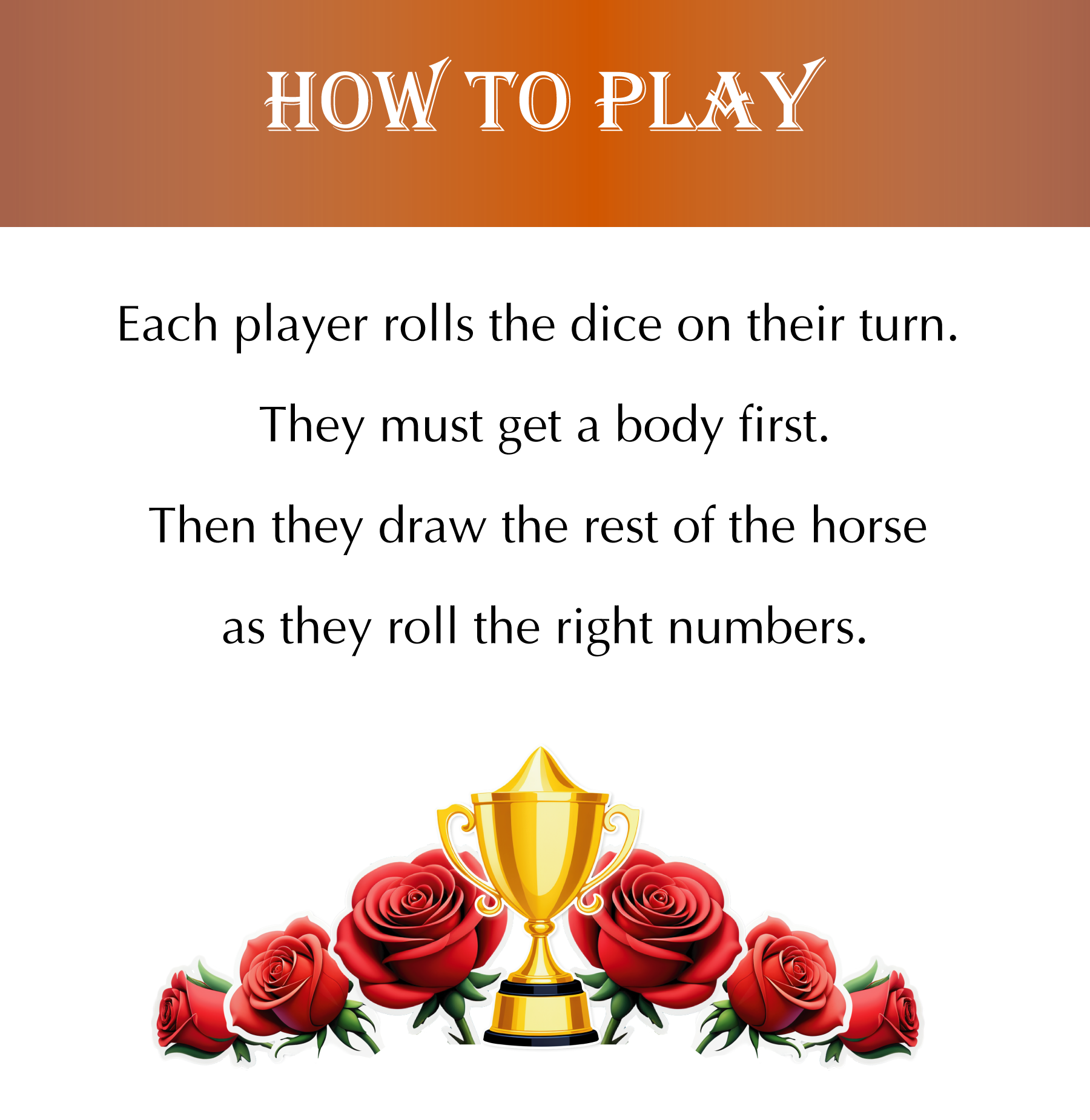 Add the the excitement of you Kentucky Derby party with this easy Roll A Horse party game printable! Players take turns rolling the dice and adding to their horse drawing. Will you be the first player to finish their horse? Play and find out.