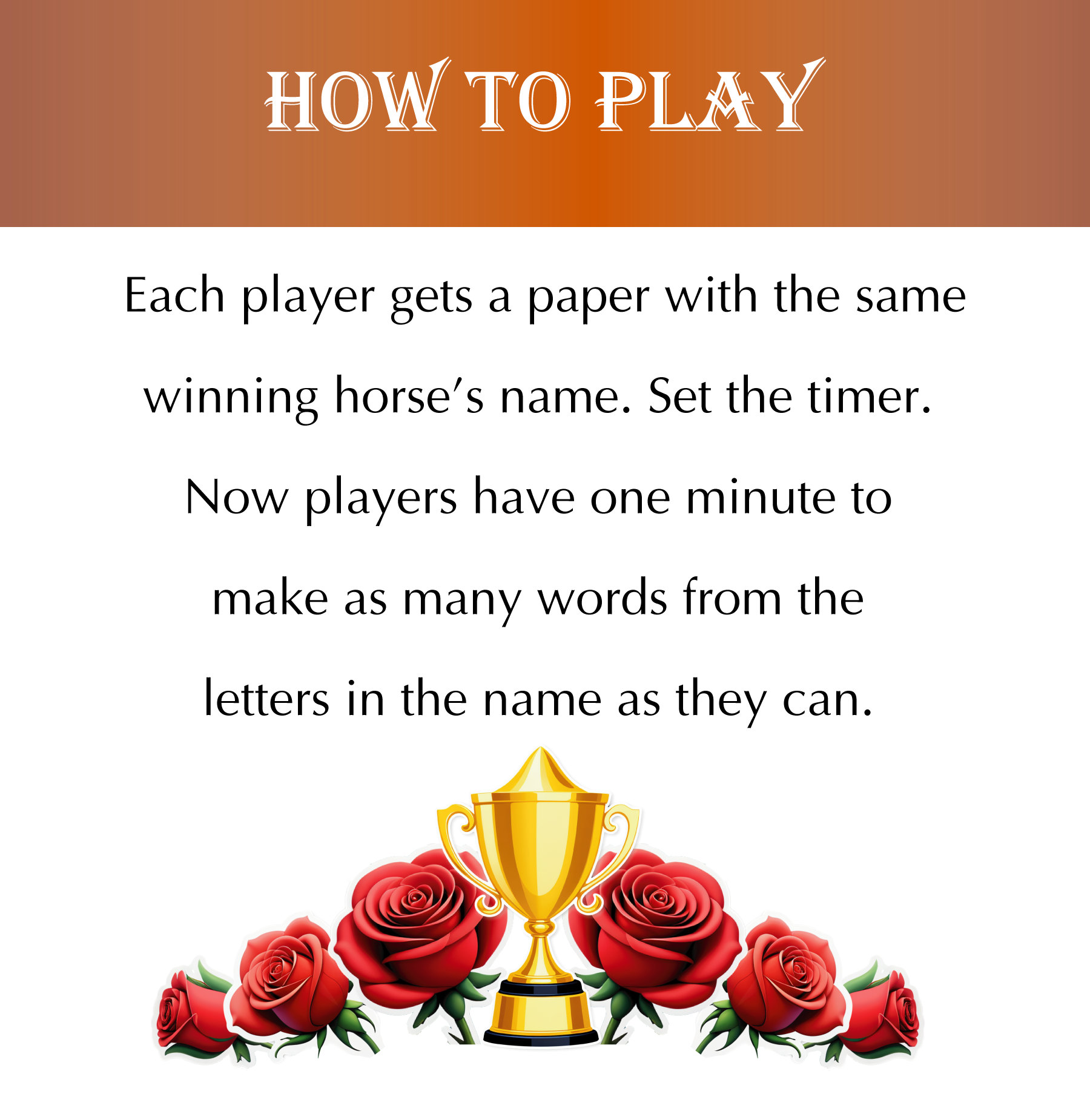 What’s in a name is a Kentucky Derby party game where players race to make as many words as they can using only the letters in past winner’s names. Great for in between races!