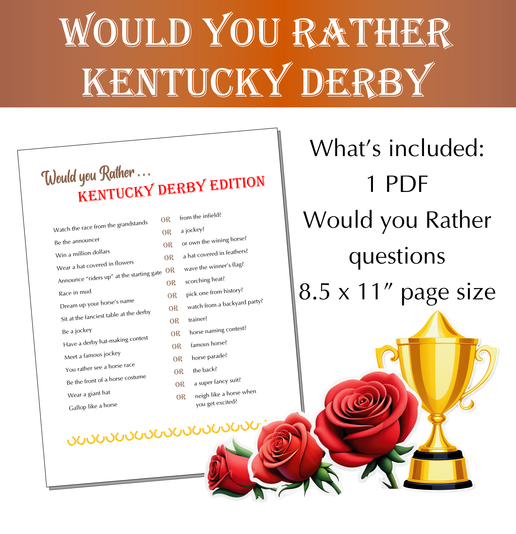 These are more questions are asked in this fun and easy Kentucky Derby Would you Rather game. Give your guests something to talk about in-between races all with a derby theme!