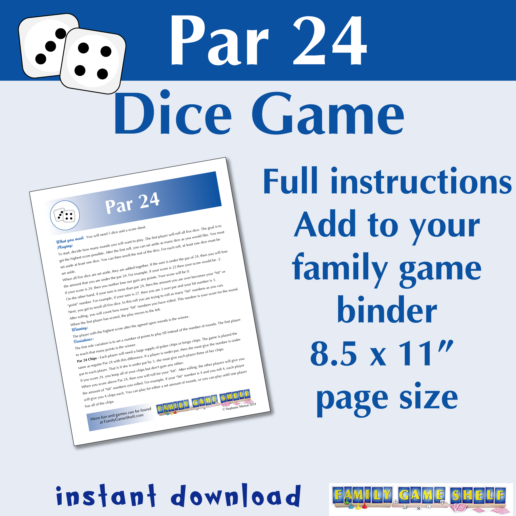 The Par 24 dice game brings the golf course to your game table. But you don’t need to be a golf fan to love this one! Get the full rules to add to your Family Game binder and always have something to play on game night.