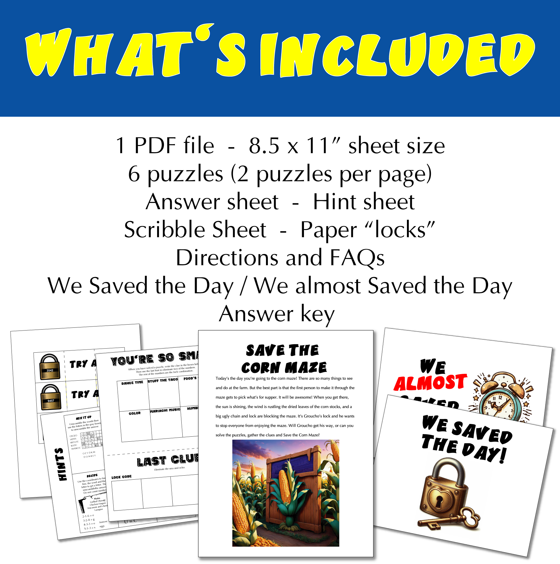 The evil Groucho has struck again! He’s locked the gates the to corn maze! Now all the fun you were going to have is ruined. Unless… Will you be the hero and solve the puzzles to get the clues to Save the Corn Maze?