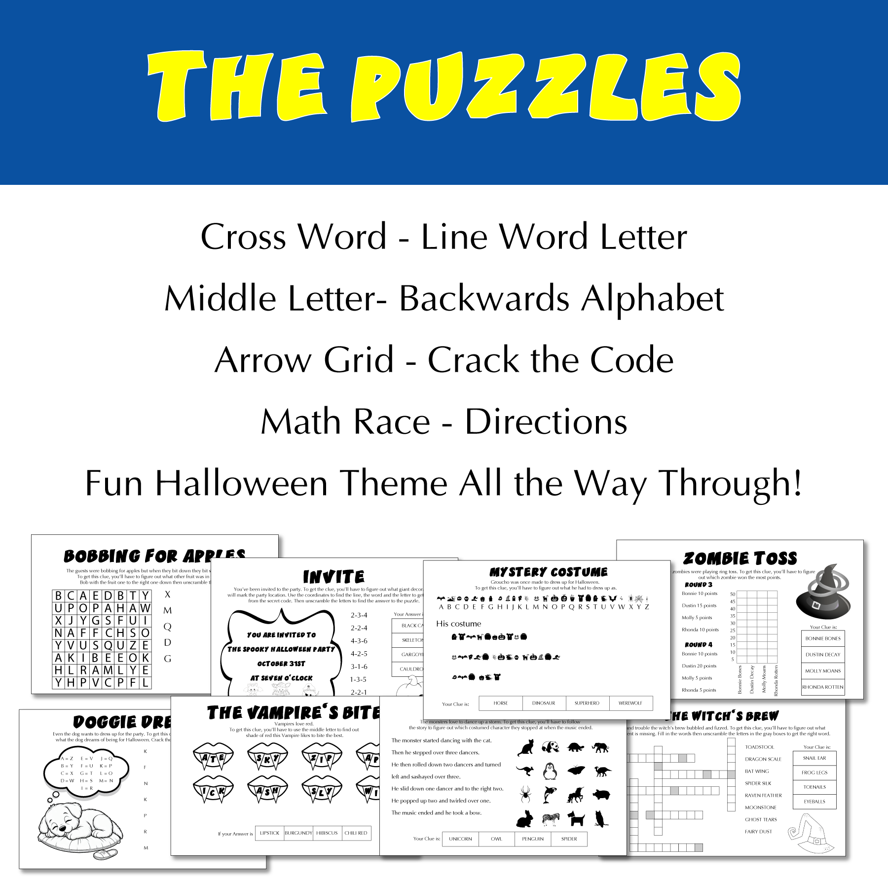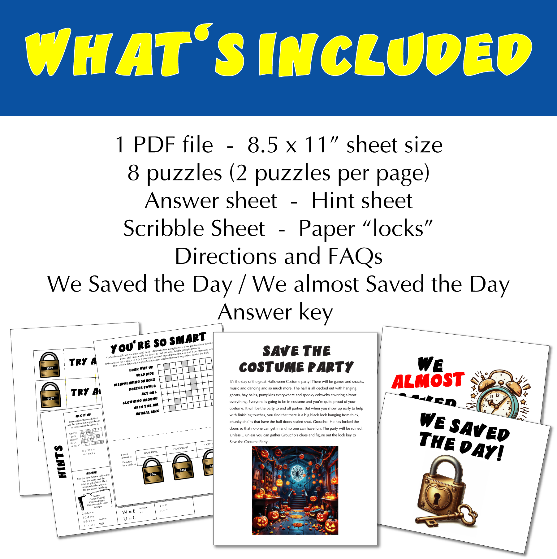 The evil Groucho strikes again! This time he has locked the doors on the Halloween costume party. The party will be ruined! Unless you can solve the puzzles to get the clues and unlock them and Save the Costume Party!