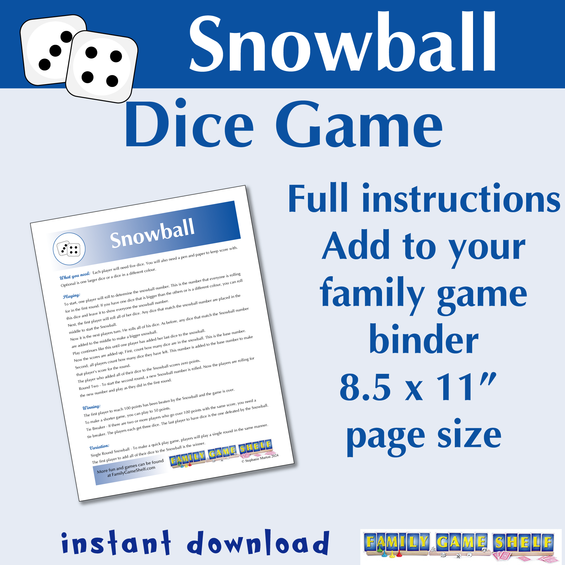 The Snowball dice game is a fast and easy game that players of all ages will want to play again and again. Will you be the first player to add all of your dice to the communal snowball? Find out in this FGS original game!