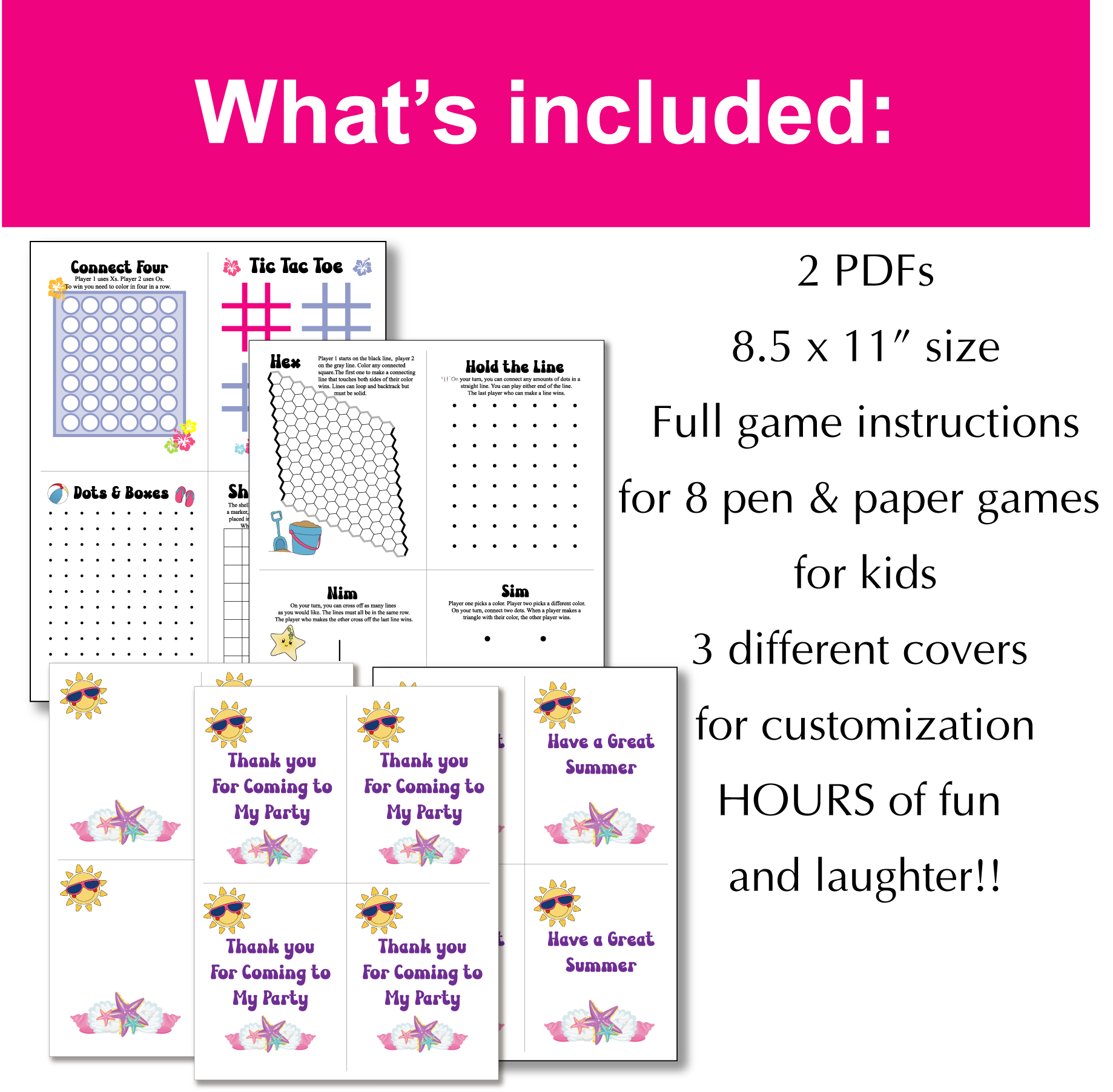 Send your guests home with the party favor that has hours of fun! These Summer Paper and Pen games are perfect for kids as they are easy to learn and fast to play. Kids love them! Prefect for birthday parties, summer parties, luaus, and summer gifts for students!