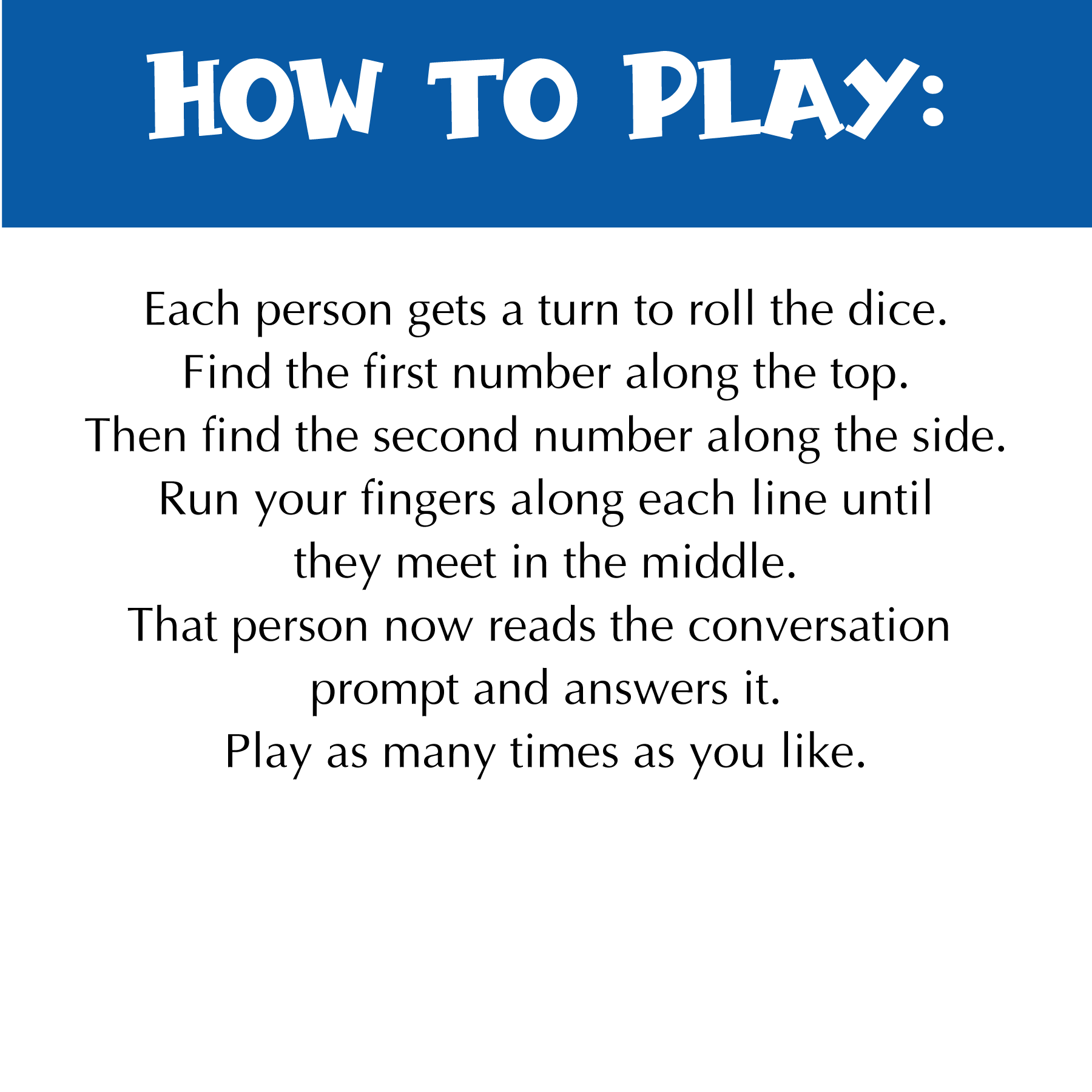 Players take turns rolling the dice and finding the icebreaker question that lines up with their dice rolls. Then they read the question and answer it.