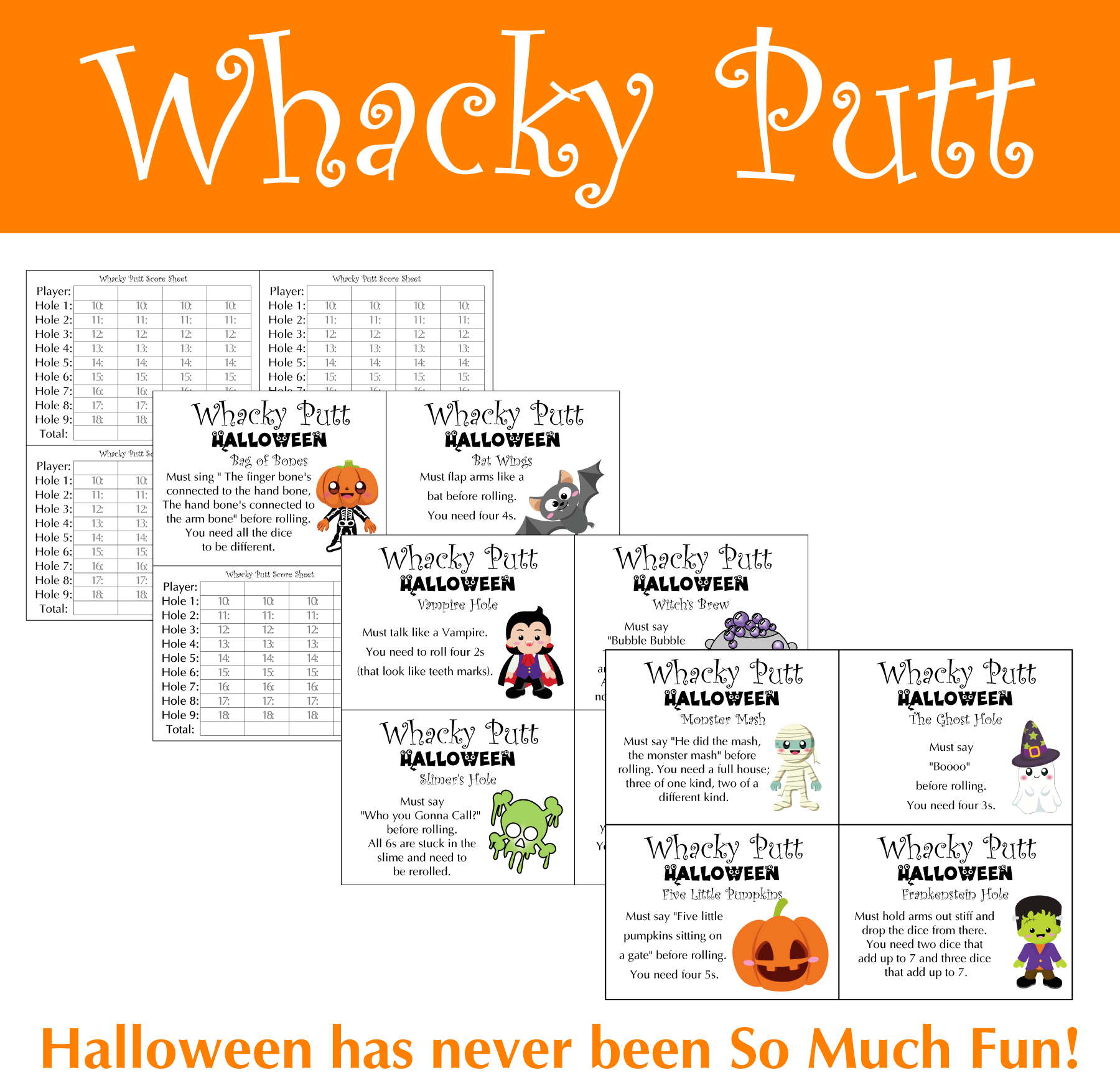 There are 10 fun holes that have fun actions and unique goals to do with a Halloween theme. Kids and parents will love the fun, cute cards and laugh out loud as they play the holes.