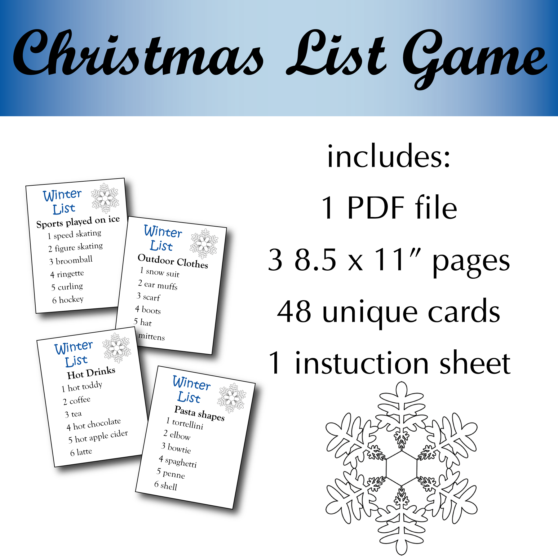 The game cones with 48 unique question lists and has full instructions. Simply print (we recommend printing on card stock) cut and play. This family friendly game is great for team play or for playing as individuals. Perfect for Winter parties, holiday parties or just for family game night.