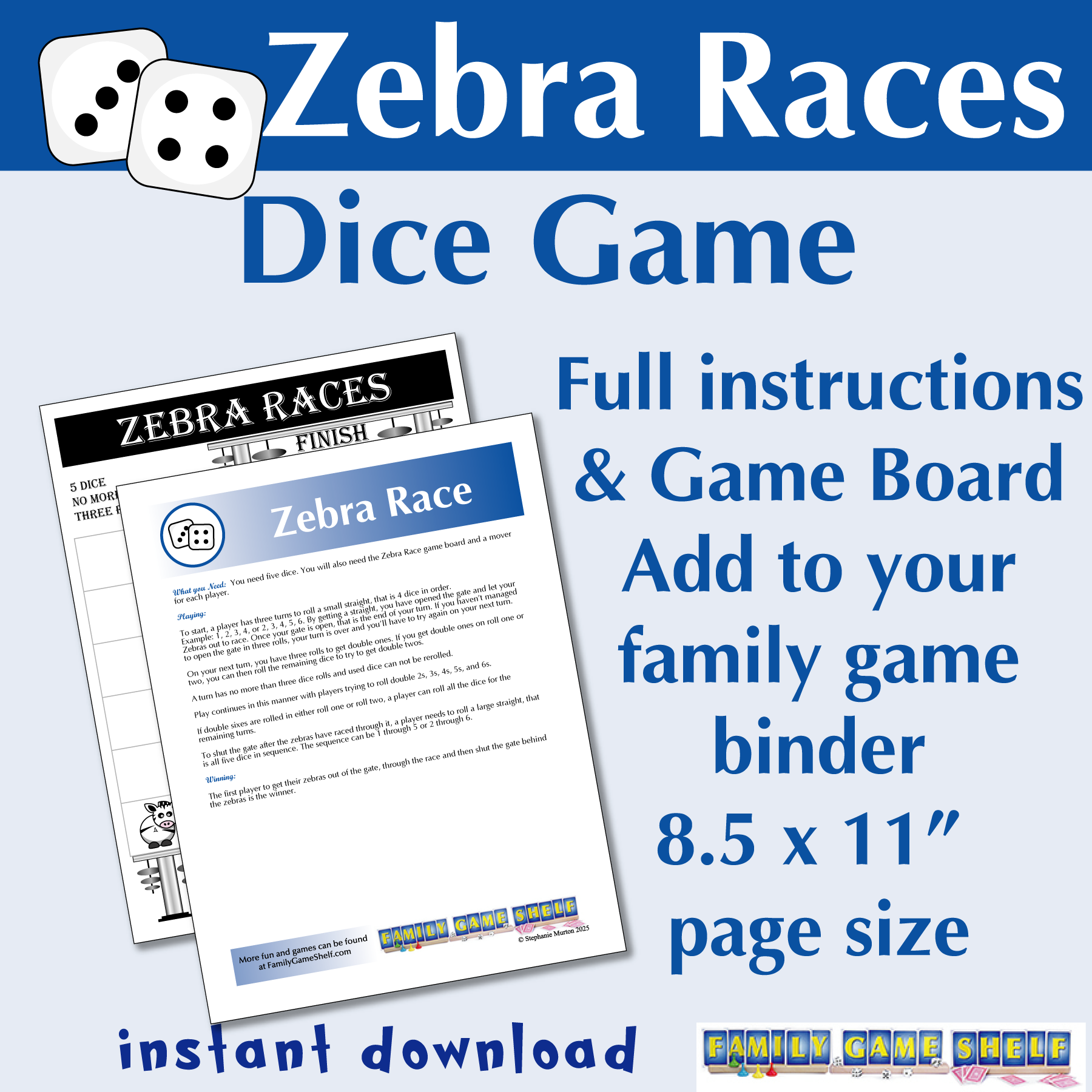 Get ready, get set and race your zebras! The Zebra Races dice game is a fast paced race that is an Fame Game Shelf original. Game board included!