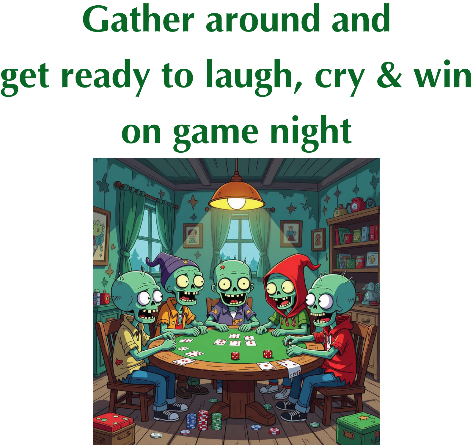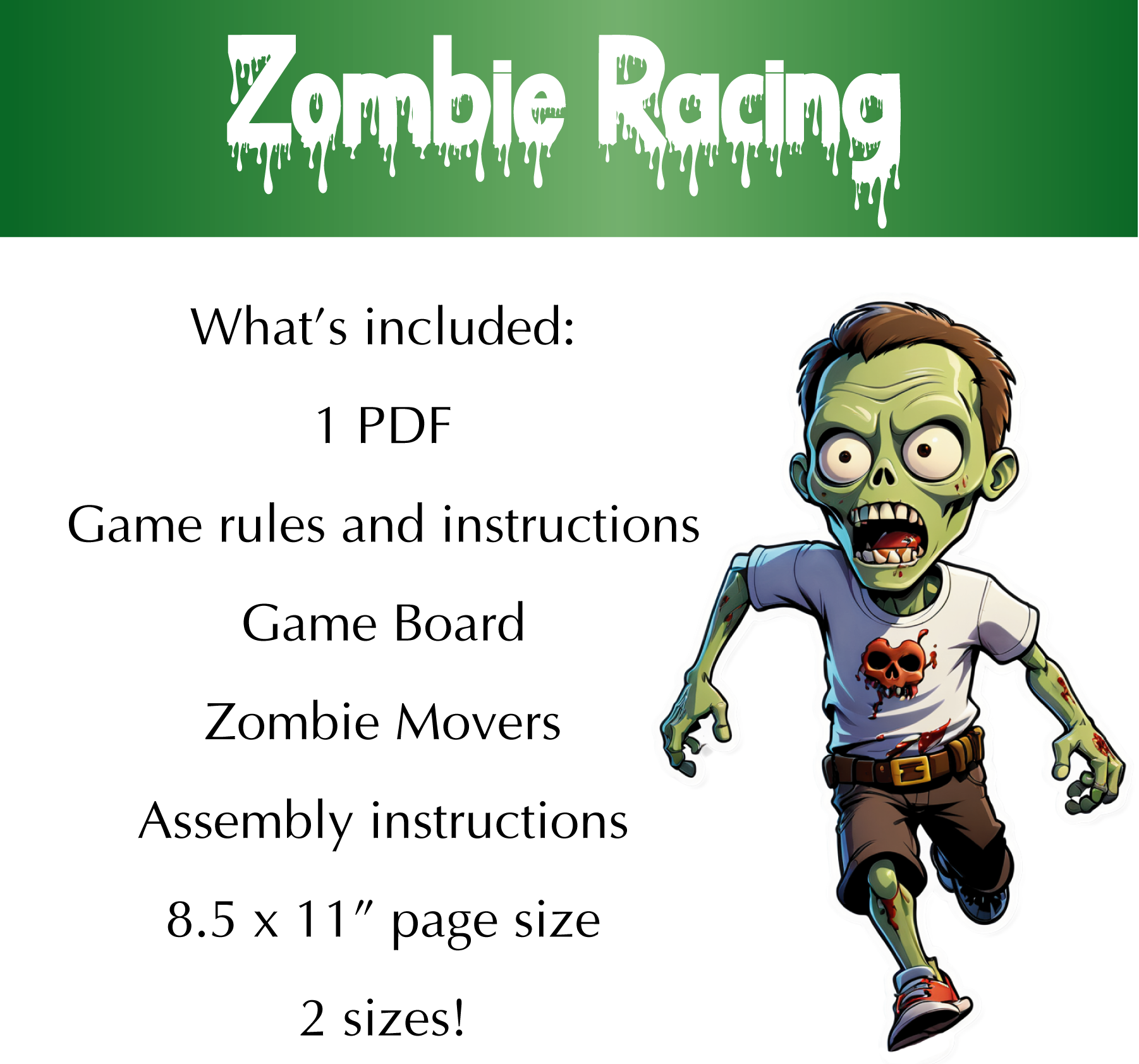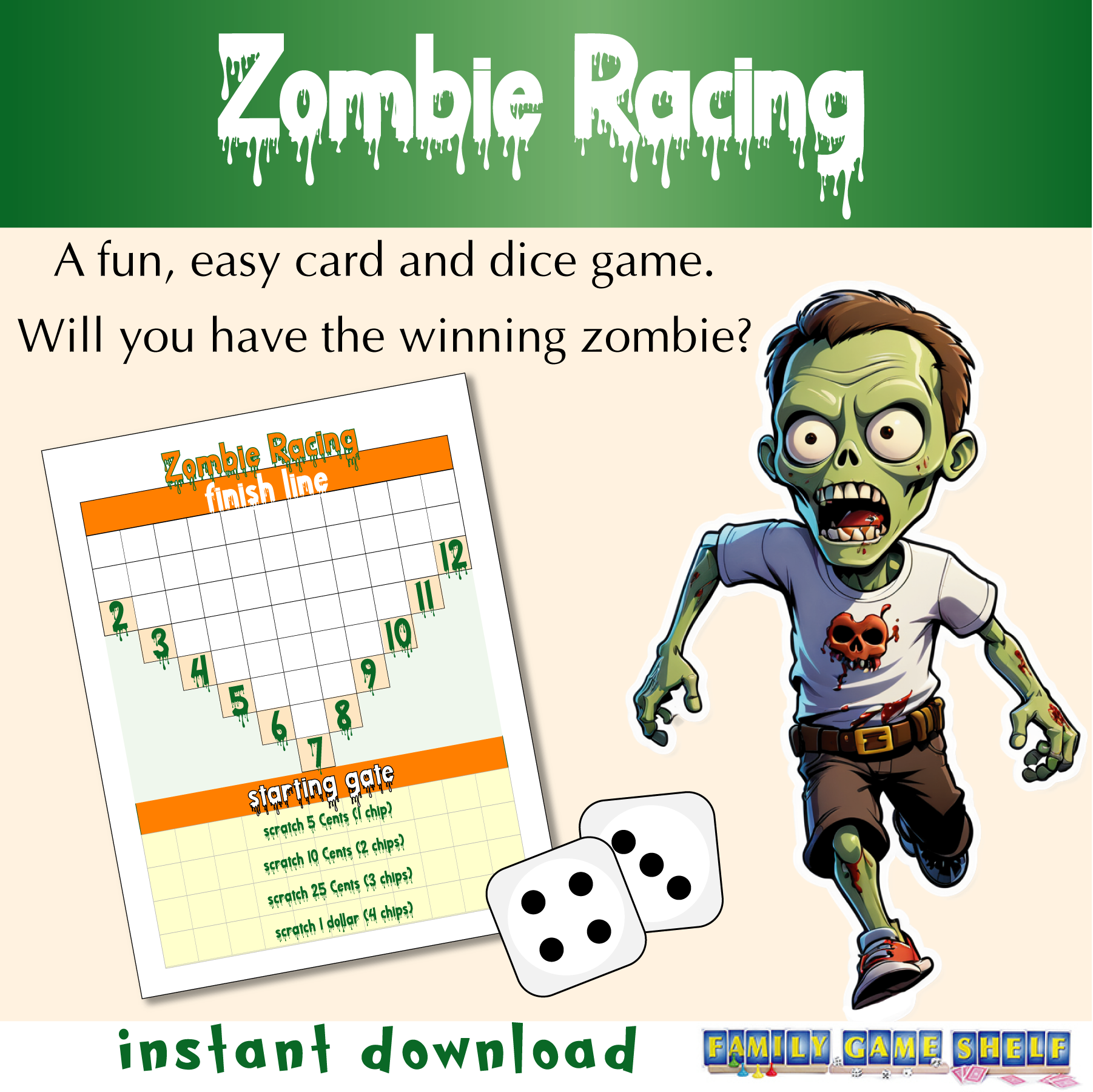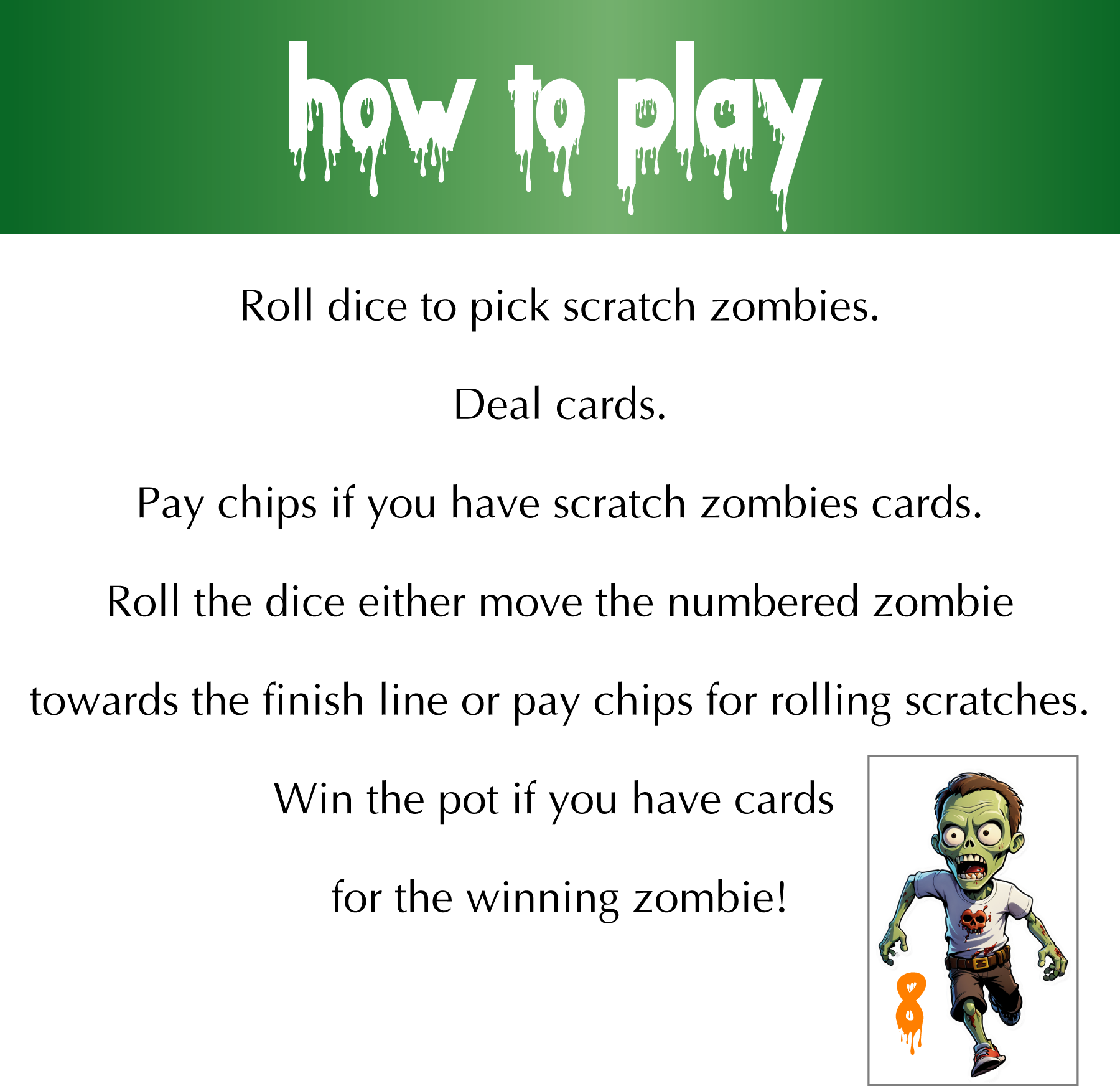 The Zombie Racing game is a fast pace game of fortune and loss. Roll the dice to pick the scratch zombies, deal cards, pay for scratch zombies. Then roll the dice to move the zombies or pay the price. Will you have the cards for the winning zombie? The classic horse racing game in a fun Halloween party theme!